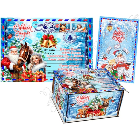 Фанера. Подарок упакован в красочный пакет с новогодней символикой. Внутри письмо поздравление от Деда Мороза.