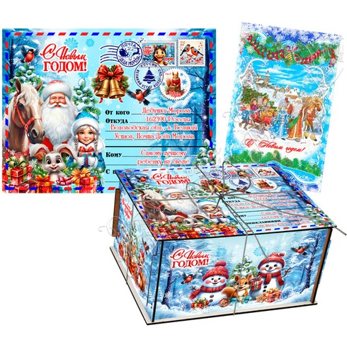Фанера. Подарок упакован в красочный пакет с новогодней символикой. Внутри письмо поздравление от Деда Мороза.