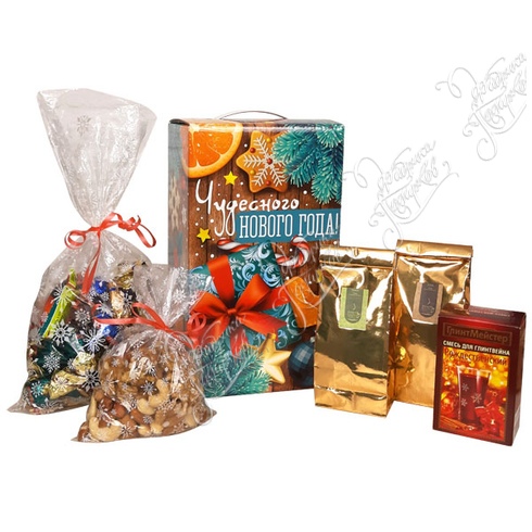Состав: Конфеты 500г, Чай черный 50г, Чай зеленый 50г, Смесь ореховая 200г, Смесь для глинтвейна 44г.